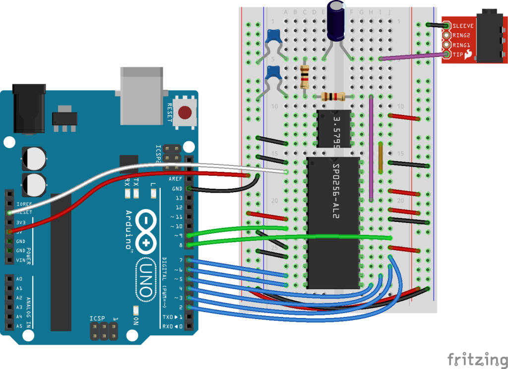 Here are the required connections for the SP0256A-AL2 to the crystal, output circuit and the Arduino:
