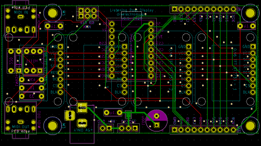 I had to use a custom footprint for the displays, but it is loosely based on an Adafruit display component. I have two versions – one with mounting holes and one without. Even through the mounting holes are present in the “user drawings” layer, they are not actual holes on the PCB.