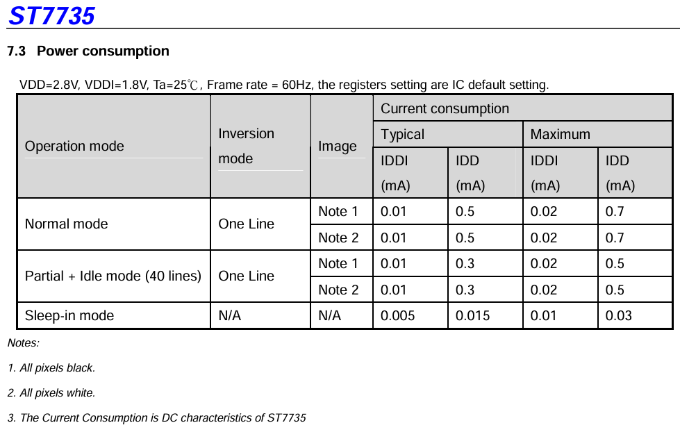 In terms of current usage of a ST7735 display, the datasheet states the following: