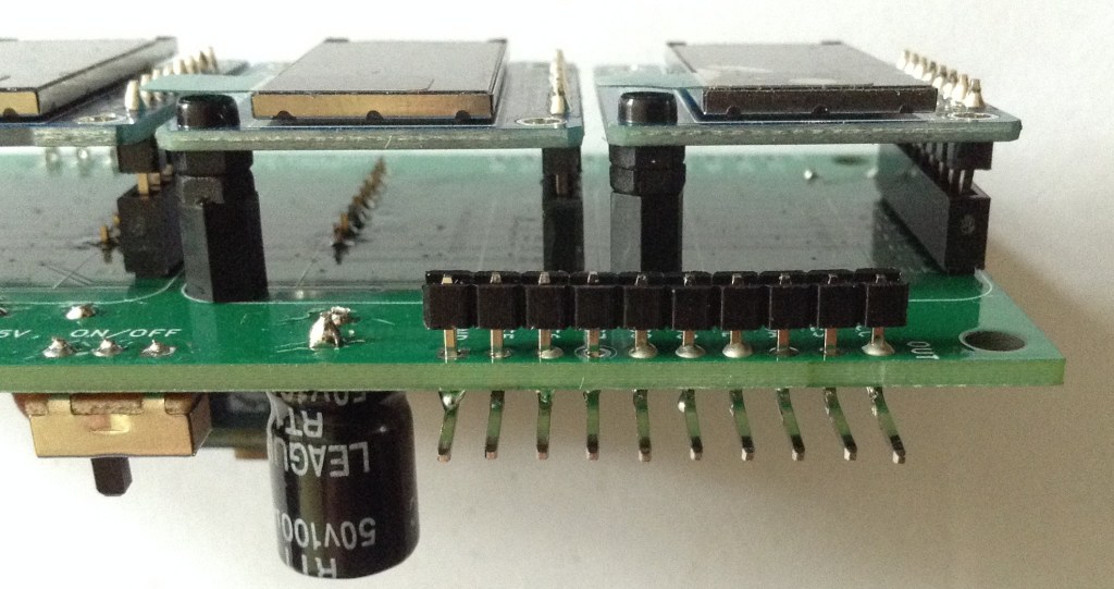 To do this, I pushed the spacers to the edge of the bent pin headers and then pushed the whole thing through the PCB prior to soldering. Once soldered, the plastic spacers can be removed and the pins clipped, but in the photo below the spacer has been left.