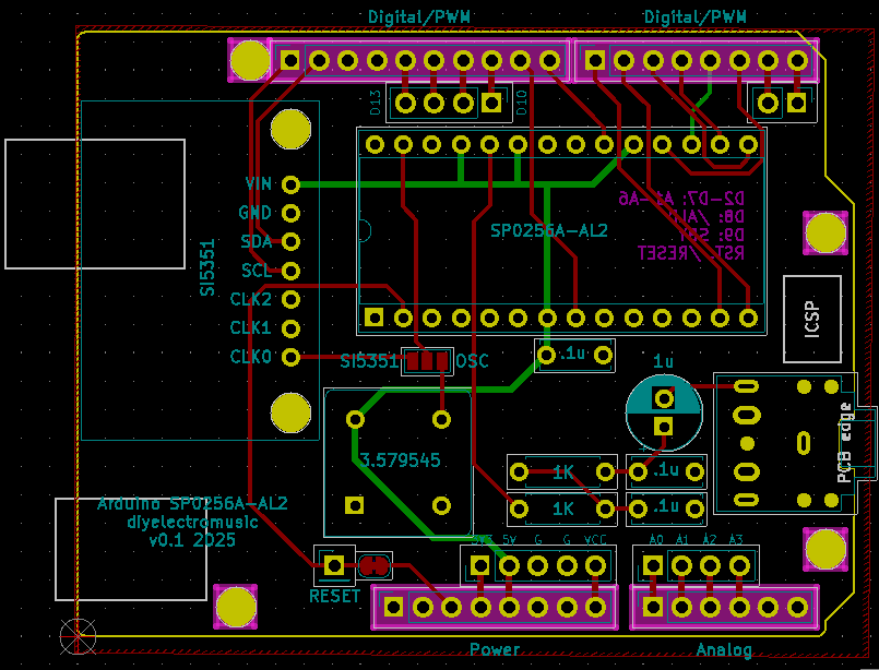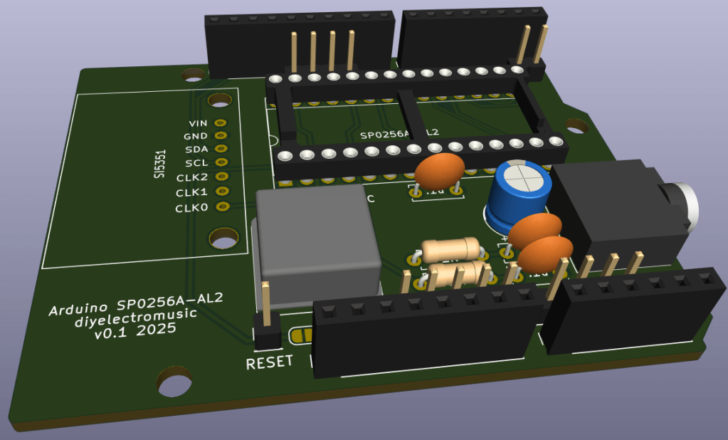 There is also a (default closed) solder jumper on the RESET line in case there is a need to separate out the reset of the SP0256A-AL2 from the Arduino.