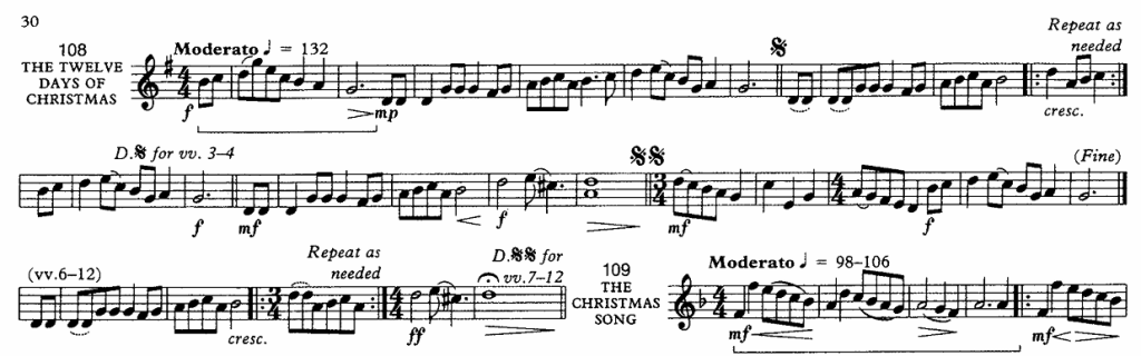 This is the most compact notation of the tune that I know of. This is from the “Christmas Praise” Brass Band carol book, which seems to be one of the most common references for any band out caroling at this time of year.