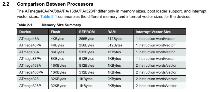 The only difference between the ATMega48, 88, 168 and 328 is the amount of memory. They are named for the amount of flash memory – 4K, 8K, 16K, 32K respectively. But otherwise they are functionally identical. Here is the key data from the datasheet: